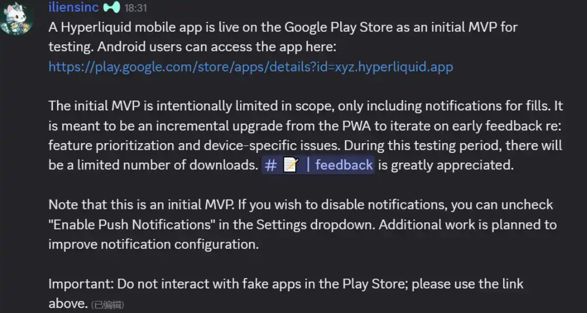 Mensaje de Deep Tide TechFlow, 1 de abril, según un mensaje del canal de Discord de Hyperliquid: la aplicación móvil de Hyperliquid para Android ya se ha publicado oficialmente en la tienda Google Play. Actualmente, como versión de producto mínimo viable (MVP) inicial, se ofrece a los usuarios para pruebas.