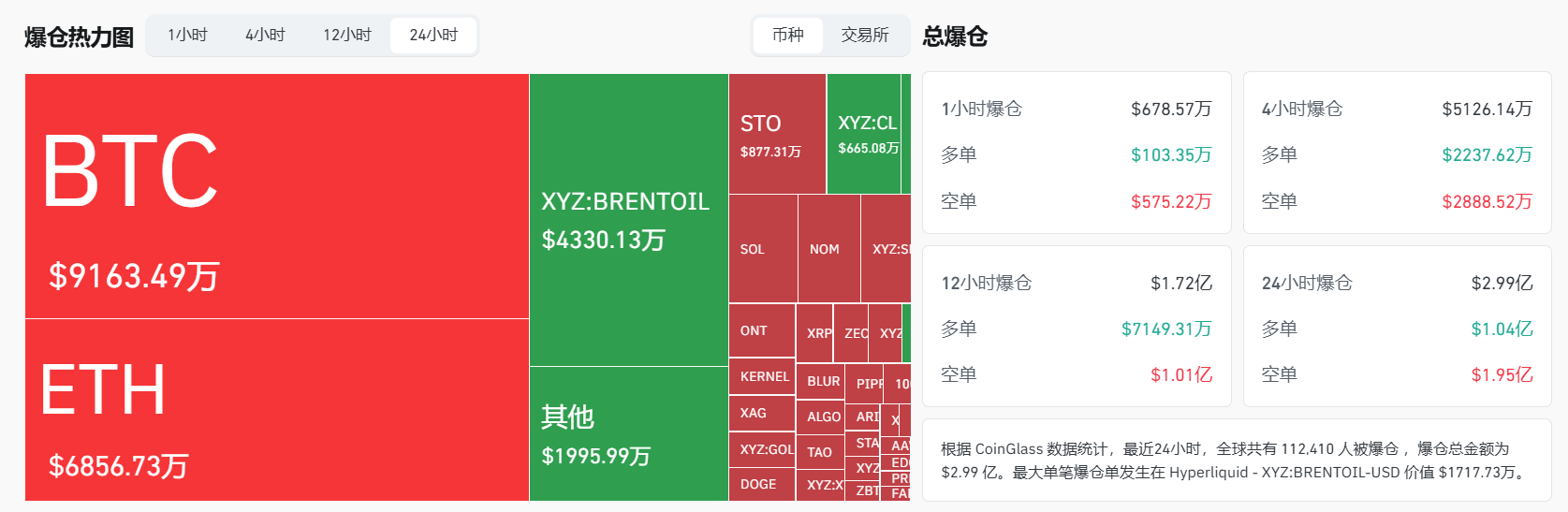 El monto de las liquidaciones forzadas de BTC alcanzó 9163.49 millones de dólares, y el de ETH fue de 6856.73 millones de dólares. En las últimas 24 horas hubo un total de 112,410 personas liquidada, y la mayor liquidación forzada en una sola operación ocurrió en el par de negociación XYZ:BRENTOIL-USD de Hyperliquid, con un valor de 1717.73 millones de dólares.