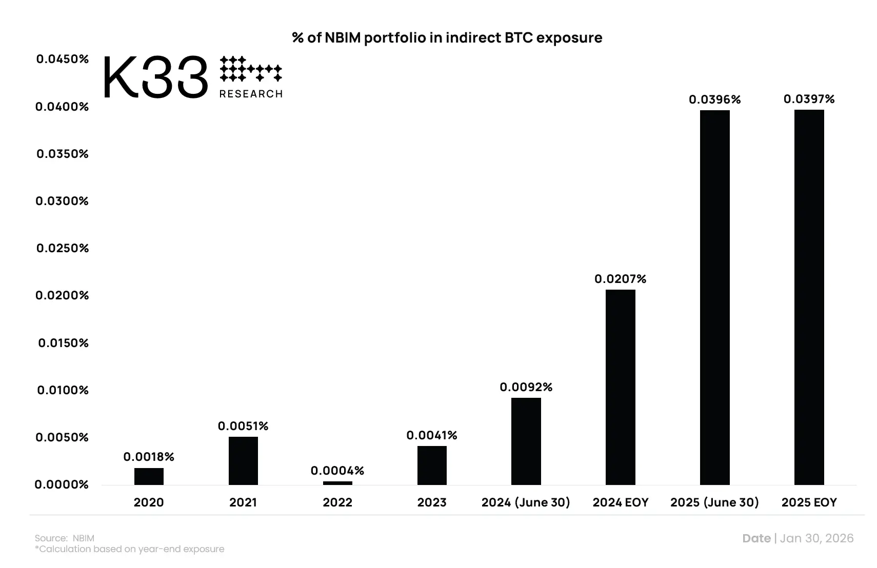 ノルウェー・クローネ(NOK)建てで見ると、NBIMは2025年末までにビットコインに対して約85億NOKの間接的エクスポージャーを保有している。ただし、ビットコイン関連資産の実際の配分比率は、年初の水準とほぼ変わらず、ファンドの総資産のわずか0.04%未満にとどまっており、これは多様化戦略の結果であり、意図的な決定ではない可能性がある。