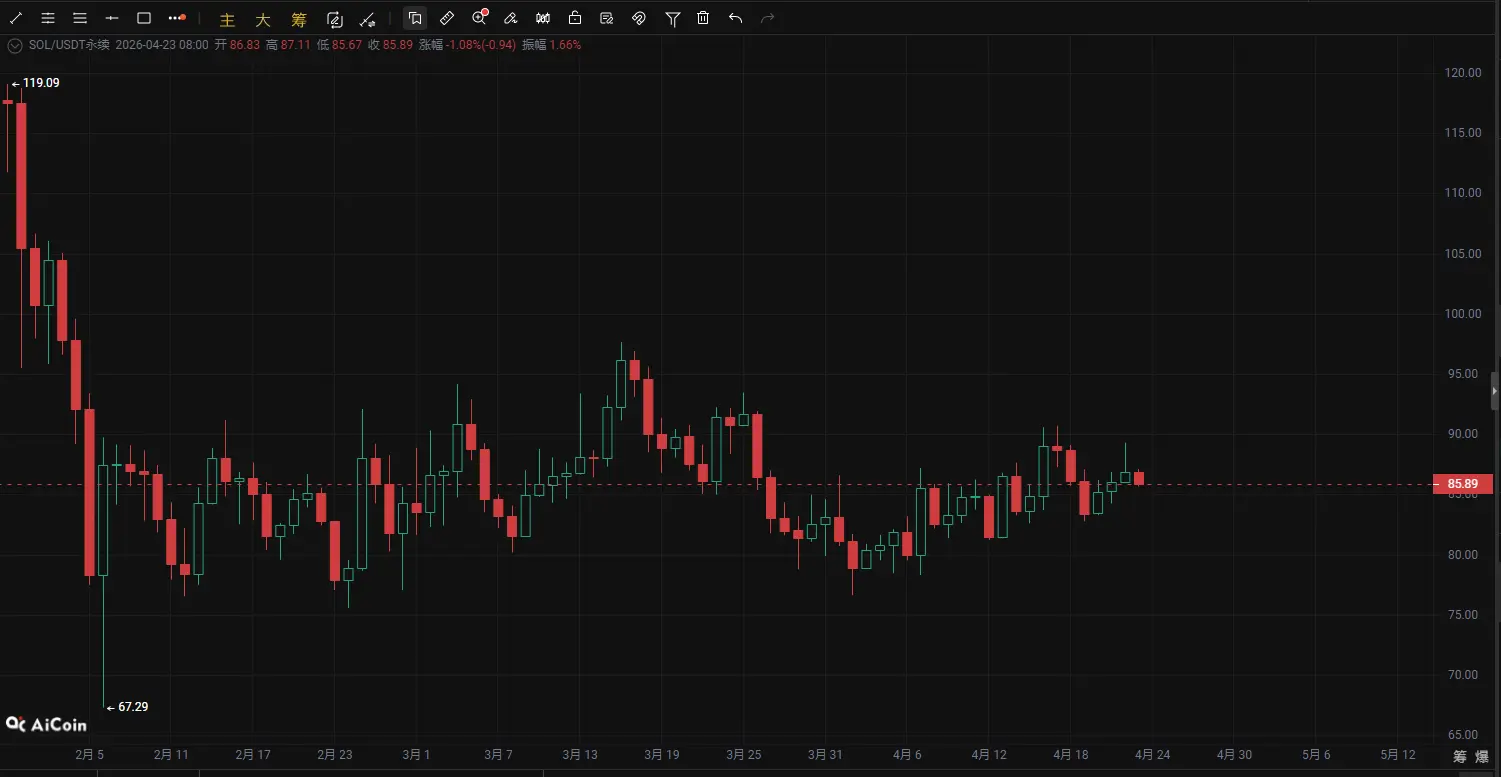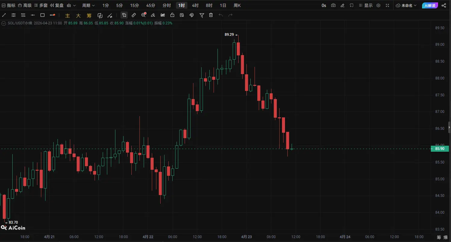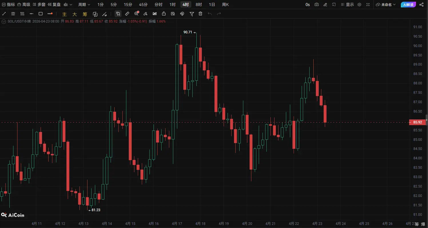 Até 23 de abril, Solana (SOL) preço atual de 85,88 USDT. Do ponto de vista da estrutura geral de velas, o SOL passou por uma grande correção anterior, atualmente completou a formação de um fundo de fase e entrou na fase de reparo de tendência. O preço atual está operando próximo de uma zona de resistência crítica, com os lados comprador e vendedor travando uma batalha intensa ao redor da marca de 85 dólares.