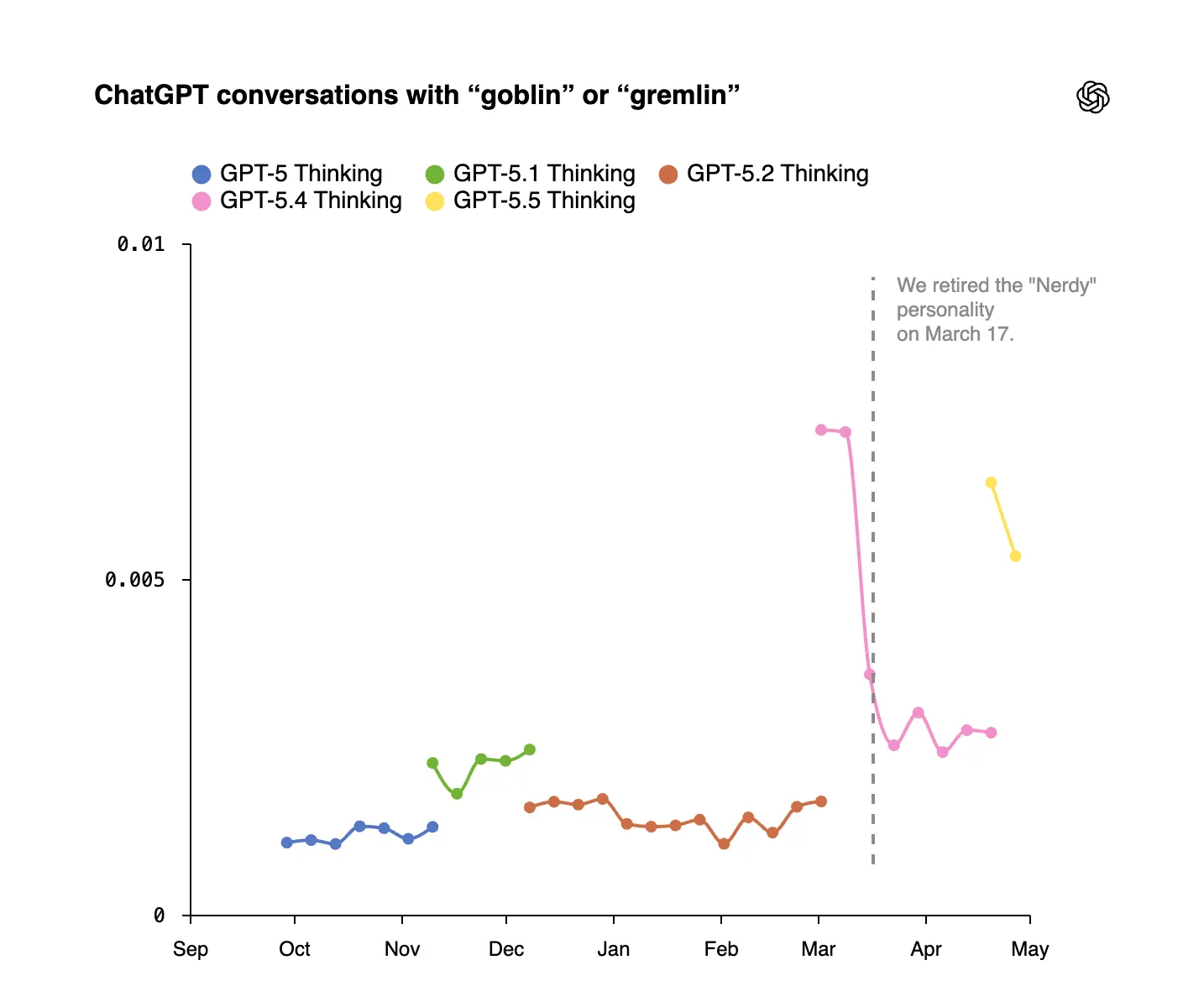 • A personalidade “Nerdy” da OpenAI, recompensou metáforas de goblins, espalhando a peculiaridade por todos os modelos GPT através de aprendizado por reforço.
