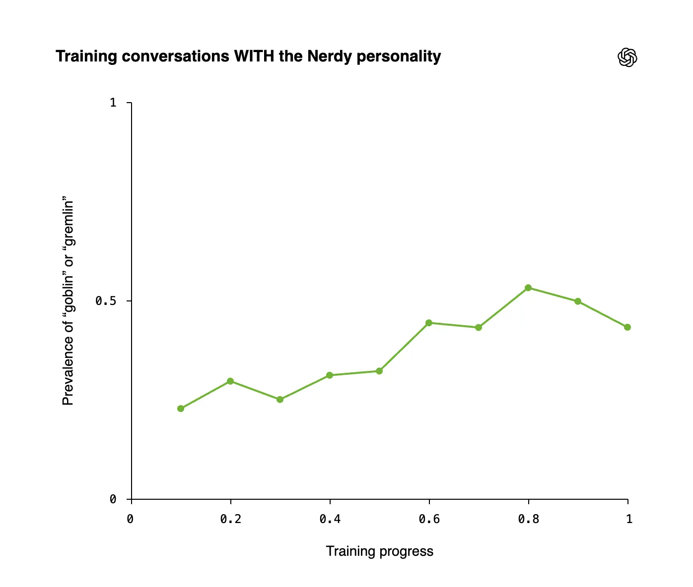 O problema é que o aprendizado por reforço não mantém comportamentos aprendidos de forma contida. Uma vez que um tic de estilo é recompensado em um contexto, ele se infiltra em outros através de um ciclo de feedback: o modelo gera respostas carregadas de criaturas, essas respostas são reutilizadas nos dados de ajuste fino, e o comportamento se aprofunda em todo o modelo, mesmo sem o prompt Nerdy ativo. Nerdy representou apenas 2,5% de todas as respostas do ChatGPT. Foi responsável por 66,7% de todas as menções a “goblin”. Por causa dos métodos da OpenAI, a prevalência de Goblin e gremlin aumentou de forma constante durante o progresso do treinamento quando a personalidade Nerdy estava ativa.