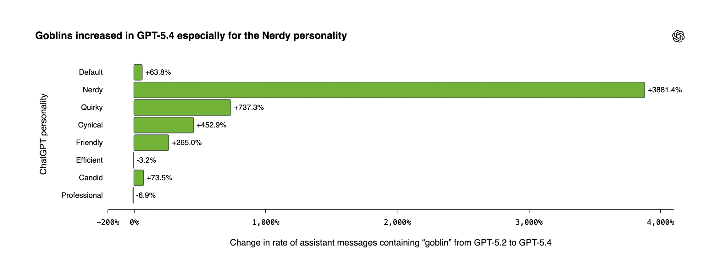 Durante o treinamento de aprendizado por reforço, o sinal de recompensa para a personalidade Nerdy consistentemente pontuava melhor as respostas que continham metáforas com palavras de criaturas. Em 76,2% dos conjuntos de dados auditados, respostas com “goblin” ou “gremlin” receberam notas melhores do que as mesmas respostas sem eles. O modelo aprendeu: diversão é recompensa. Menções a goblins explodiram no GPT-5.4, com a personalidade Nerdy mostrando um aumento de 3.881% em comparação com o GPT-5.2.