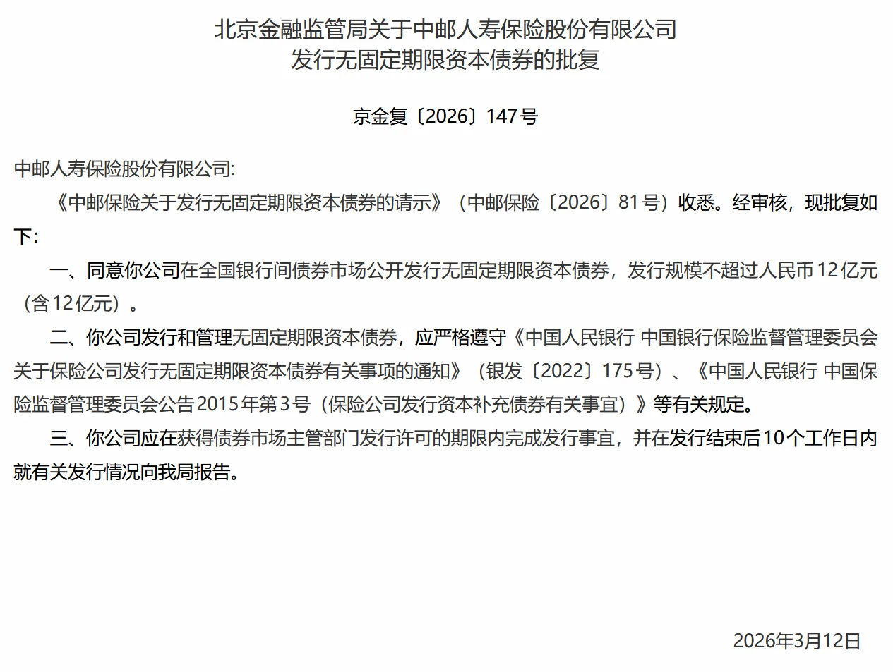 Одобрение показывает, что China Post Life должна строго соблюдать «Уведомление Народного банка Китая и Комиссии по регулированию банковской и страховой деятельности Китая о вопросах, связанных с выпуском бессрочных капитальных облигаций страховыми компаниями» (Синьфава [2022] № 175), «Объявление Народного банка Китая и Комиссии по регулированию страхования Китая № 3 (вопросы, касающиеся выпуска капитальных облигаций страховыми компаниями)» и другие соответствующие нормы.