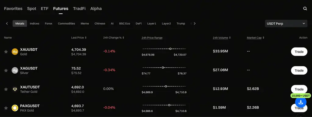 Khi hạ tầng giao dịch được nâng cấp, cách tham gia thị trường kim loại cũng dần chuyển sang trực tuyến, thông qua khu vực kim loại của Gate, người dùng có thể trực tiếp sử dụng stablecoin để tham gia giao dịch các sản phẩm phái sinh liên quan, giảm thiểu chi phí chuyển đổi trong quy trình truyền thống. Trong môi trường biến động nhanh của thị trường, thao tác tức thời này giúp nhà giao dịch điều chỉnh vị thế nhanh hơn, nâng cao hiệu quả thực thi chiến lược.