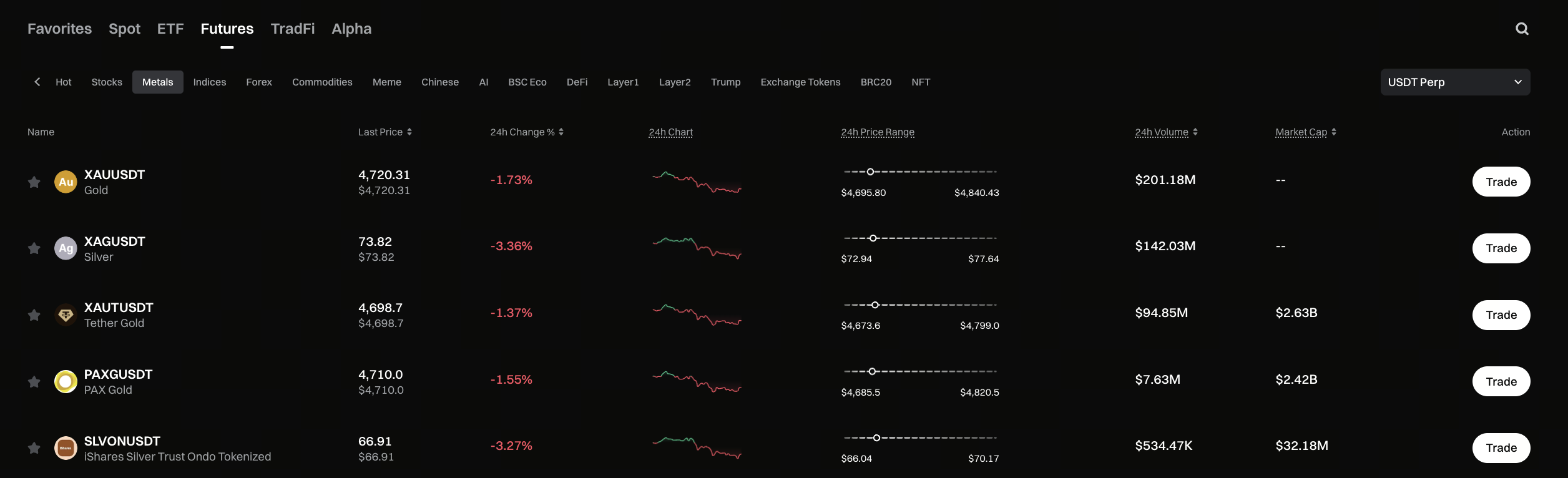 • 掌握短線波動:黃金與白銀價格的短線波動帶來快速獲利機會。投資人可透過永續合約進場,於價格波動時捕捉上漲或下跌的契機,獲取短期利潤。