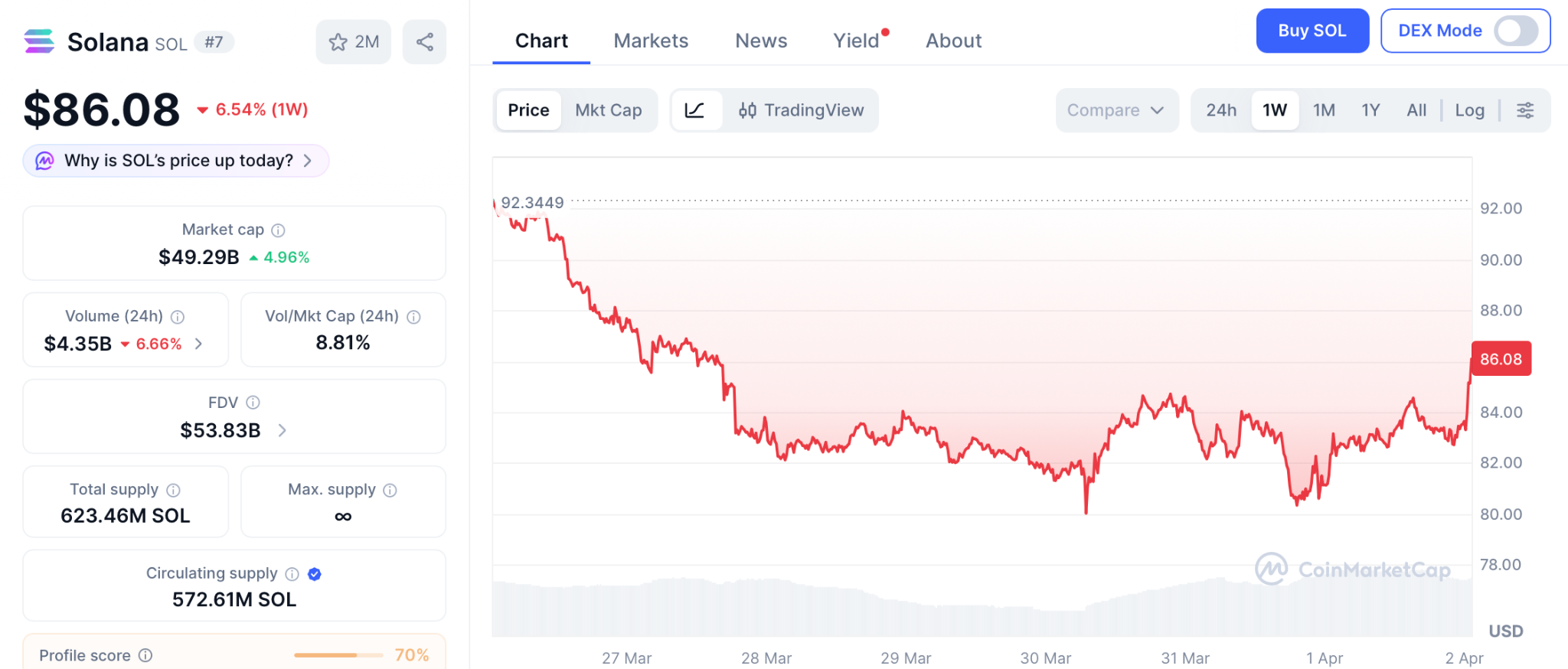 根據CoinMarketCap,SOL目前交易在86.08美元;此前在今年早些時候從高點回落。多頭必須守住75美元,否則就有滑向65美元的風險。