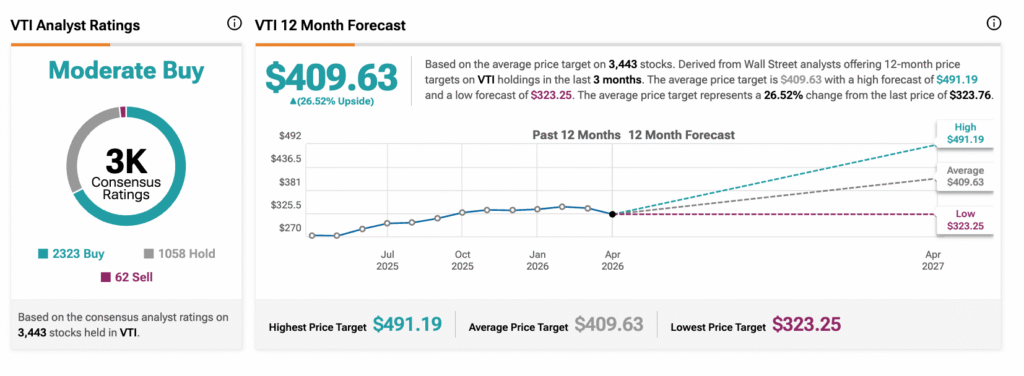 根據 TipRanks 獨特的 ETF 分析師共識(基於對其持倉的分析師評級加權平均得出),VTI 為「適度買入」。華爾街的平均目標價 409.63 美元意味著上行空間為 26.52%。