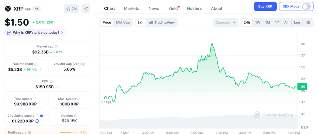 根据CoinMarketCap,XRP交易价格为1.50美元,账本记录显示交易吞吐量强劲,跨境支付采用率不断增长,CoinDesk报道。机构合作伙伴关系和监管明确性持续增强XRP作为全球金融重要参与者的地位。